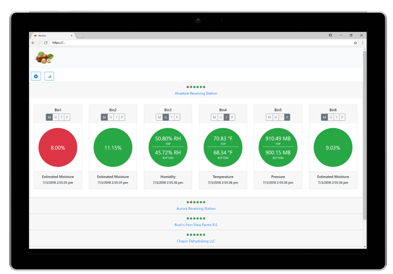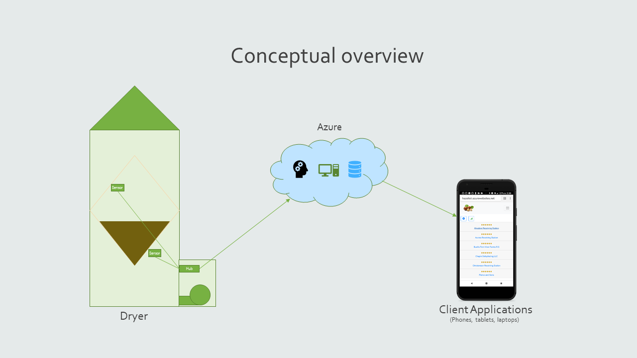 Hazelnut Monitor предоставляет веб-портал, созданный с помощью .NET Core и Aurelia и размещенный в Azure, который предоставляет информацию об операциях сушки в разных местах. Он также включает механизм правил и систему уведомлений (с использованием функций Azure), которые могут оповещать ключевой персонал с помощью SMS и уведомлений по электронной почте, когда определенные измерения выходят за пределы допустимого диапазона (например, температура слишком высокая или слишком низкая), когда датчики неисправны, или когда достигнуто целевое содержание влаги.